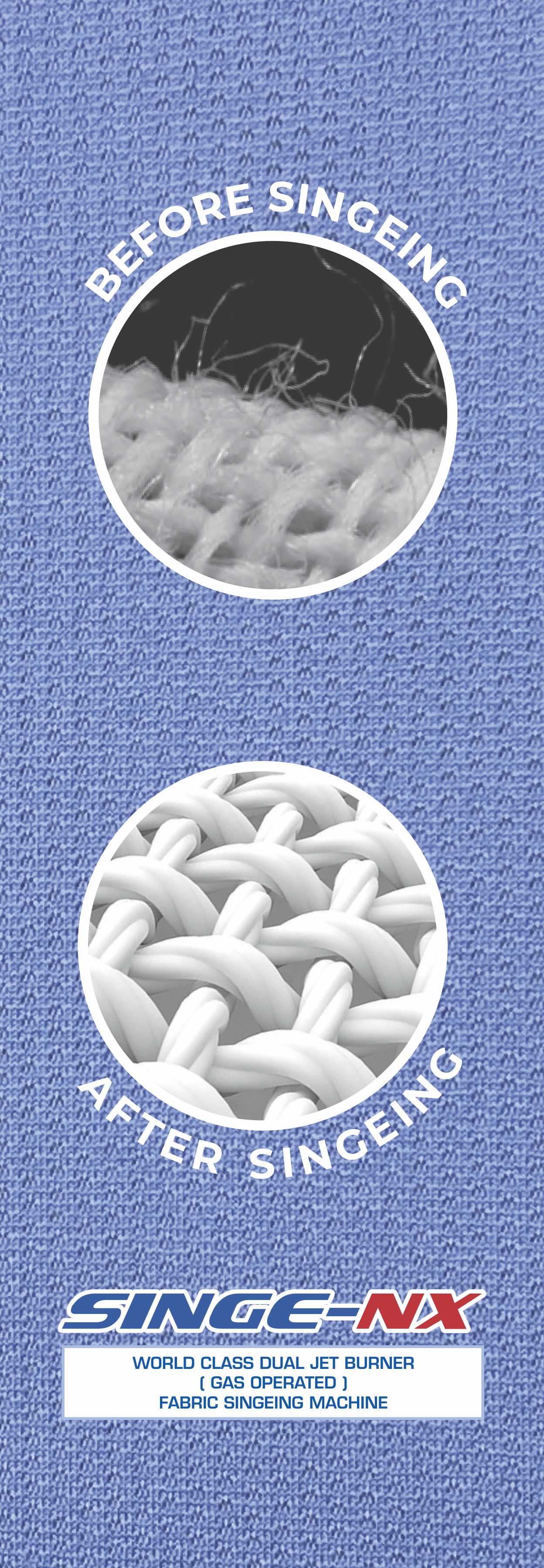 SINGEING OF WOVEN AND KNITTED FABRIC PLAYS A SIGNIFICANT PART IN FABRIC PRETREATMENT, APPEARANCE, CLEAN AND CLEAR SURFACE PRIOR TO THE FABRIC'S SUBSEQUENT PROCESS. SINGEING OF WOVEN AND KNITTED FABRIC IS DONE TO ELIMINATE AND BURN OFF THE HAIRINESS ON THE CLOTH SURFACE AND GIVE A SMOOTH SURFACE FINISH.