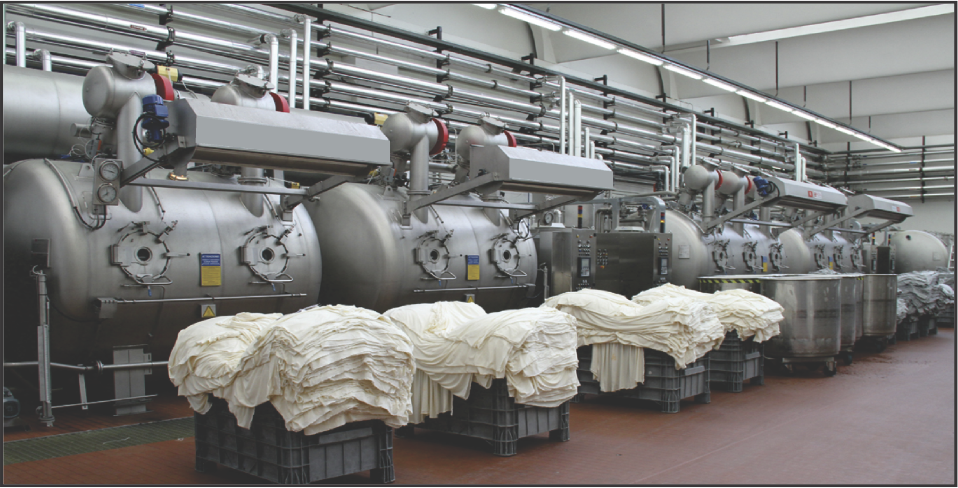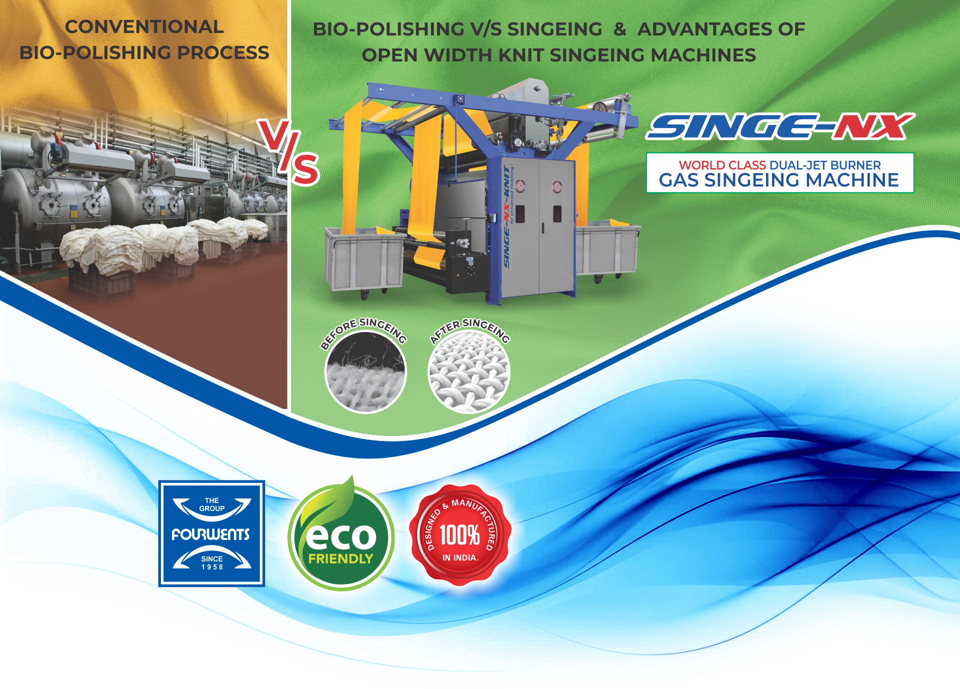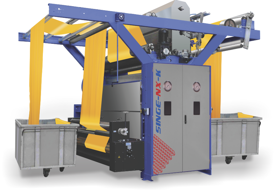 SINGEING IS THE PROCESS OF REMOVAL OF PROTRUDING FIBRES FROM THE SURFACE OF FABRIC THROUGH THE APPLICATION OF OPEN FLAMES WHILE THE FABRIC IS IN MOTION. THE FUEL TYPICALLY USED IS LPG, WITH A DEFINED RATIO OF GAS TO AIR. SINGEING HELPS IMPROVE THE FABRIC’S APPEARANCE AND REDUCES ITS TENDENCY TO FORM PILLS; THIS ALSO HELPS PREVENT THE SURFACE OF THE FABRIC FROM PICKING UP DIRT. THE SINGEING PROCESS IS PERFORMED IN THE GREY STAGE ITSELF, IN ORDER TO TAKE ADVANTAGE OF THE DRY STATE OF THE FABRIC. ALSO, SINGED FABRIC CAN BE DYED AND PROCESSED BETTER.