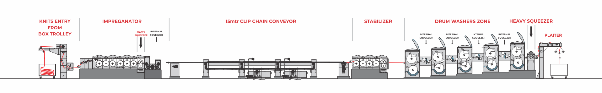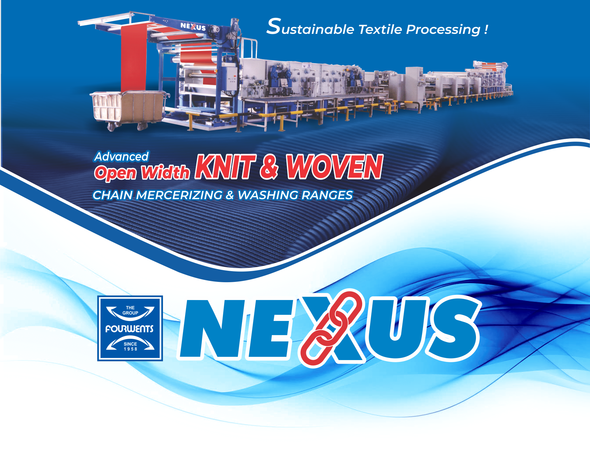 ‘NEXUS’ CHAIN MERCERIZING RANGE IS USED FOR TEXTILE PROCESSING OF OPEN WIDTH PREMIUM COTTON KNITTED FABRIC WITH HIGH QUALITY & PRODUCTIVITY. THE RANGE HAS EQUIPPED WITH AN OPTIMUM LENGTH OF PIN CHAIN SECTION FOR CONTROLLING THE WIDTH-WISE DENSITY OF FABRIC. ‘NEXUS’ CHAIN MERCERIZING RANGE GIVES FASTEST MERCERIZED EFFECT ON COTTON FIBERS WITH RESULTS OF DEEPER SHADE IN REACTIVE DYED OR PRINTED FABRICS.