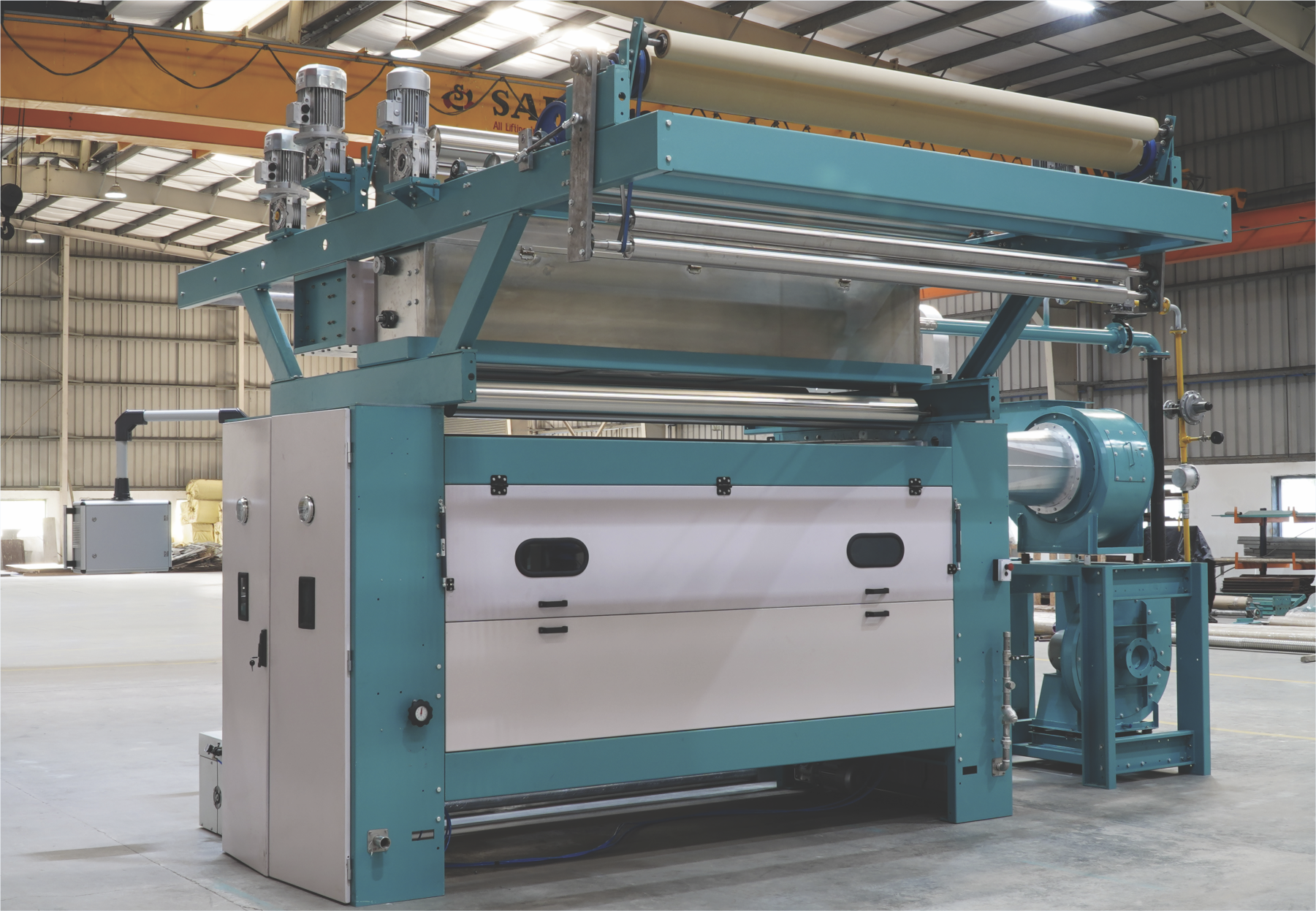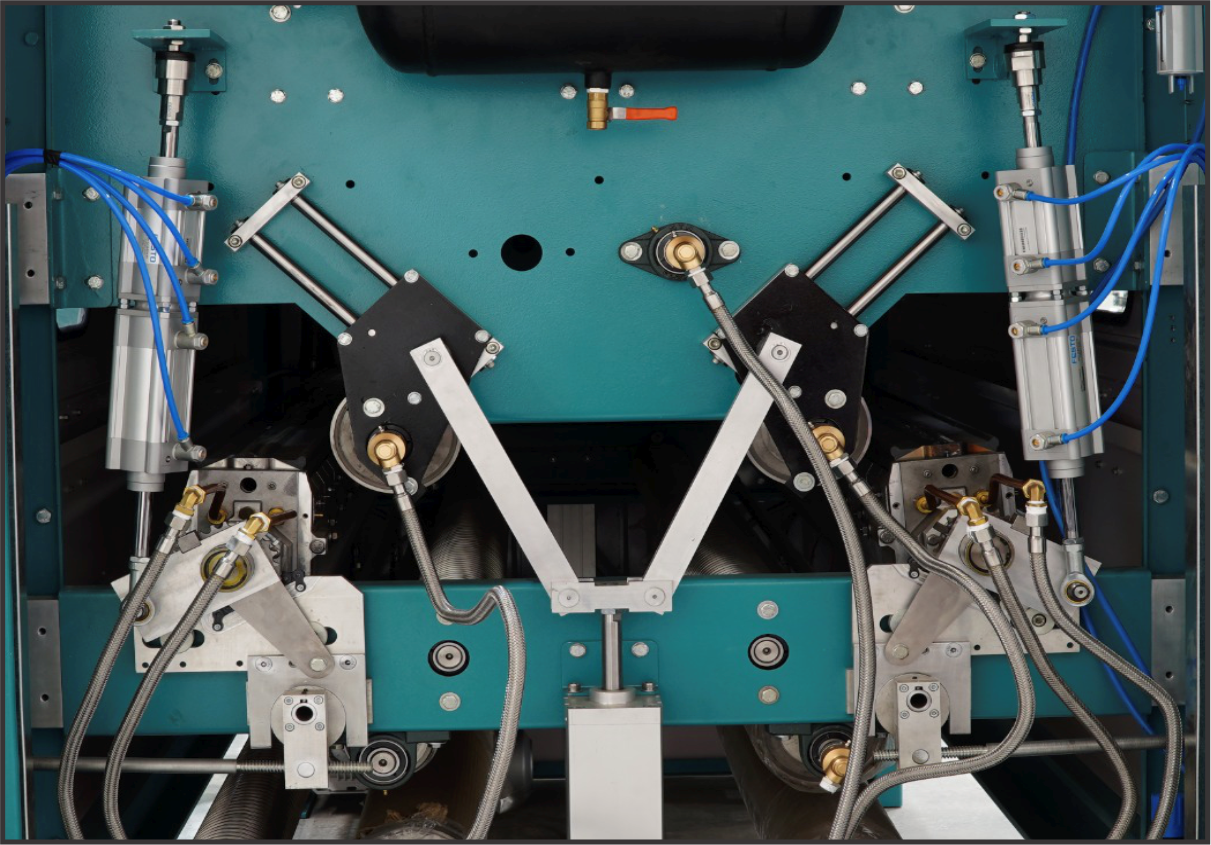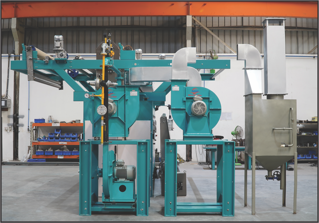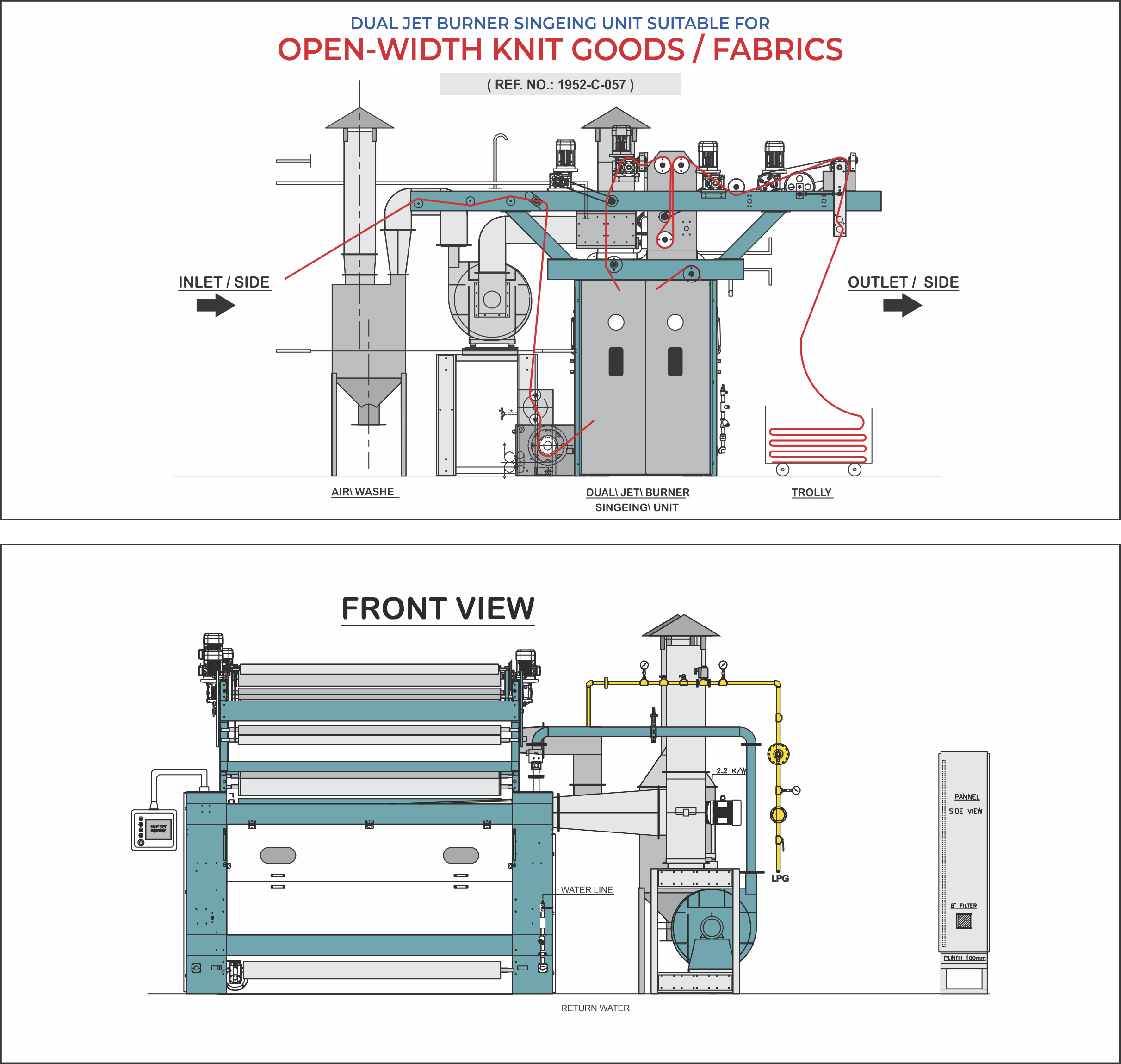 THE MACHINE IS BUILT AROUND THE TRIED-AND-TRUE COMPONENTS OF TRADITIONAL SINGE-NX SINGERS, SUCH AS BURNERS, PROPORTIONAL GAS:AIR MIXING, AND PRE-SELECTED SINGEING SETTINGS . THE MACHINE HAS THREE SINGEING LOCATIONS AND CAN SINGE THE FRONT SIDE TWICE IN ONE PASS. TANGENTIAL SINGEING, SINGEING ON THE WATER COOLED ROLLER, AND SINGEING ON THE FREE GUIDED CLOTH ARE THE THREE SINGEING POSITIONS.