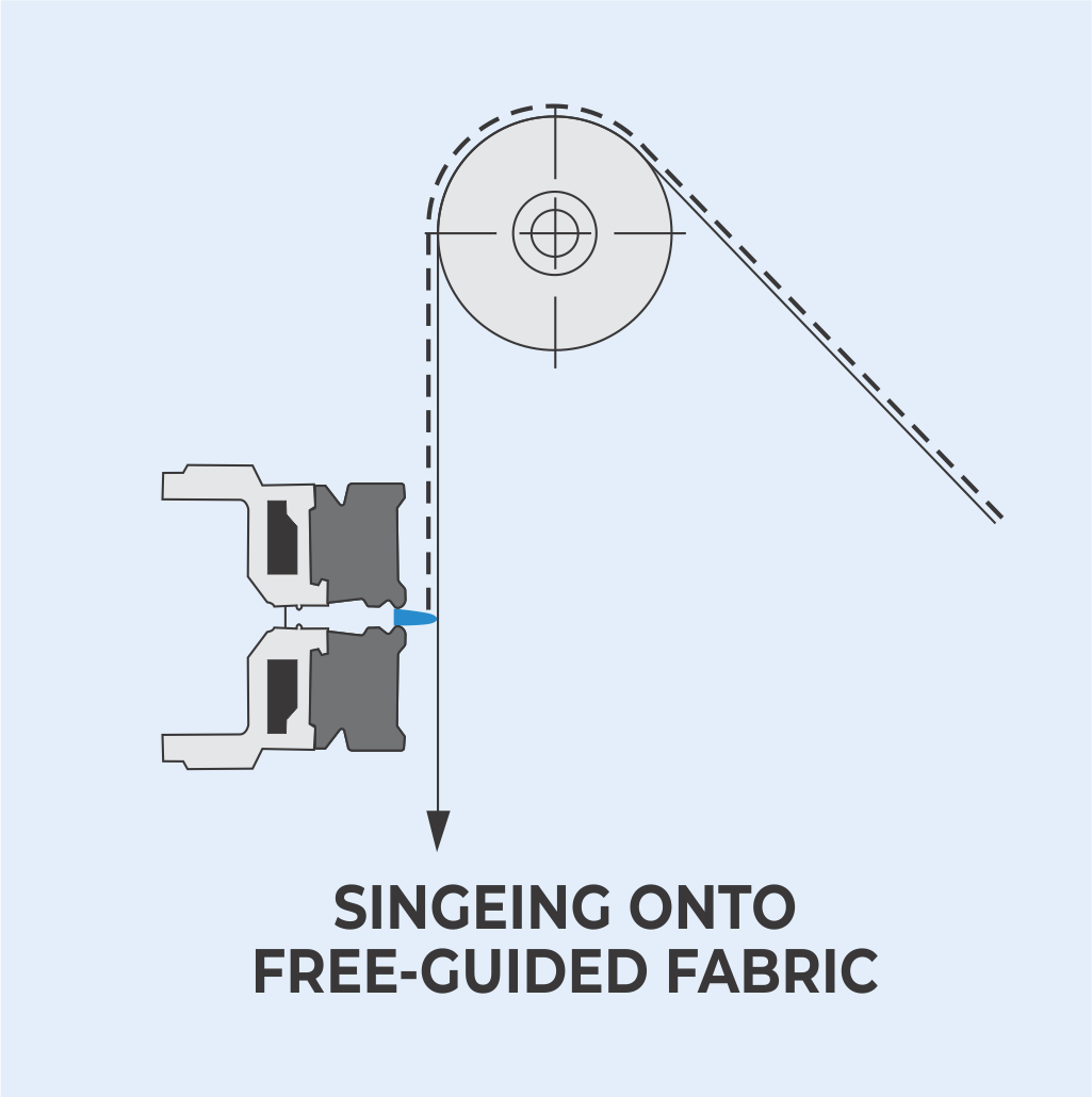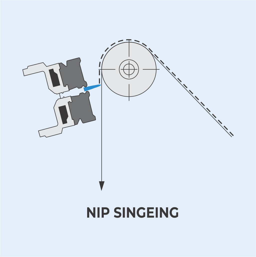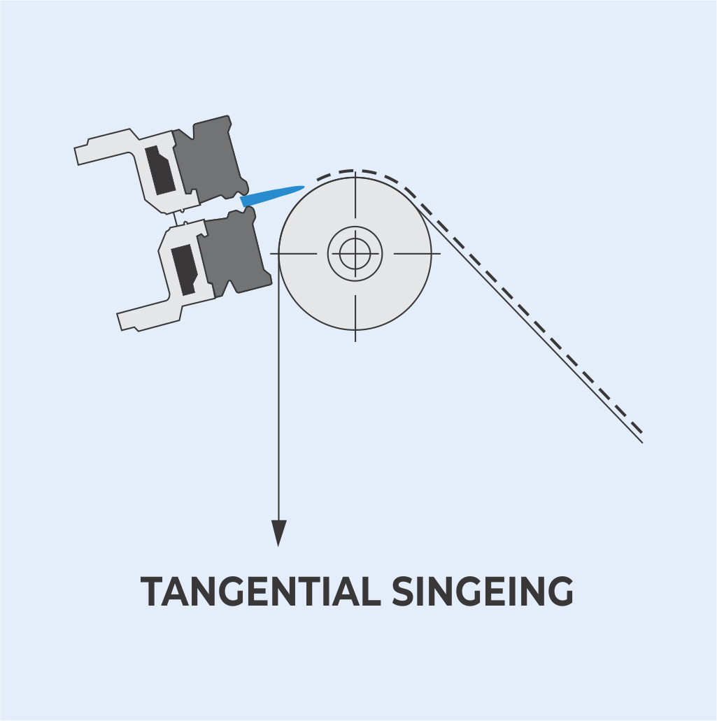 THE SINGEING PROCESS IS RECOMMENDED FOR ALL MATERIALS WHICH CANNOT TOLERATE DIRECT EXPOSURE TO FLAME. TANGENTIAL SINGEING CAN ALSO EQUALIZE PROTRUDING FIBERS AND REPAIR FILAMENT BREAKS.