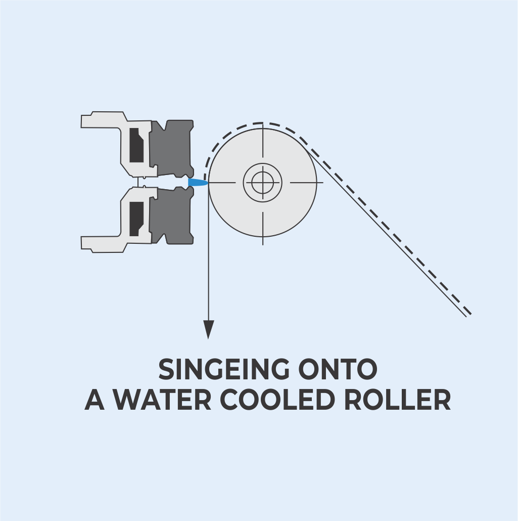 THE SINGEING FLAME MEETS AT RIGHT ANGLE ON TO THE FABRIC PASSING OVER A WATER COOLED ROLLER. THIS OPTION NORMALLY FOR QUALITY COMPOSED OF TEMPERATURE SENSITIVE FIBERS, OPEN-WEAVE BLENDED FABRICS AND THOSE WITH WEIGHTS OF LESS THAN 125g/m².