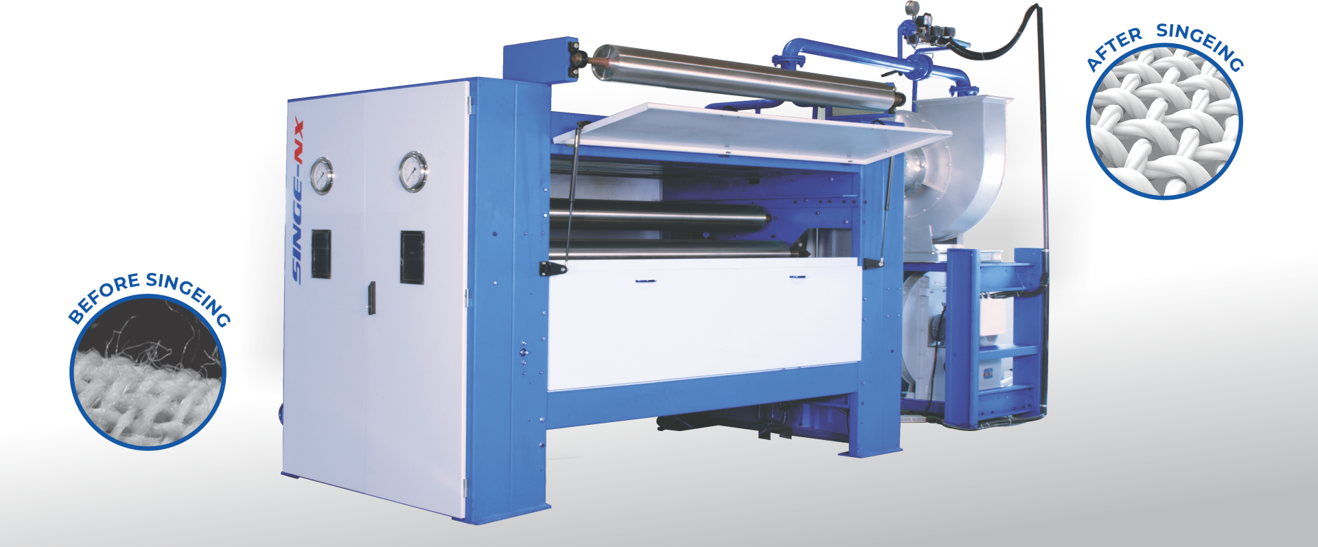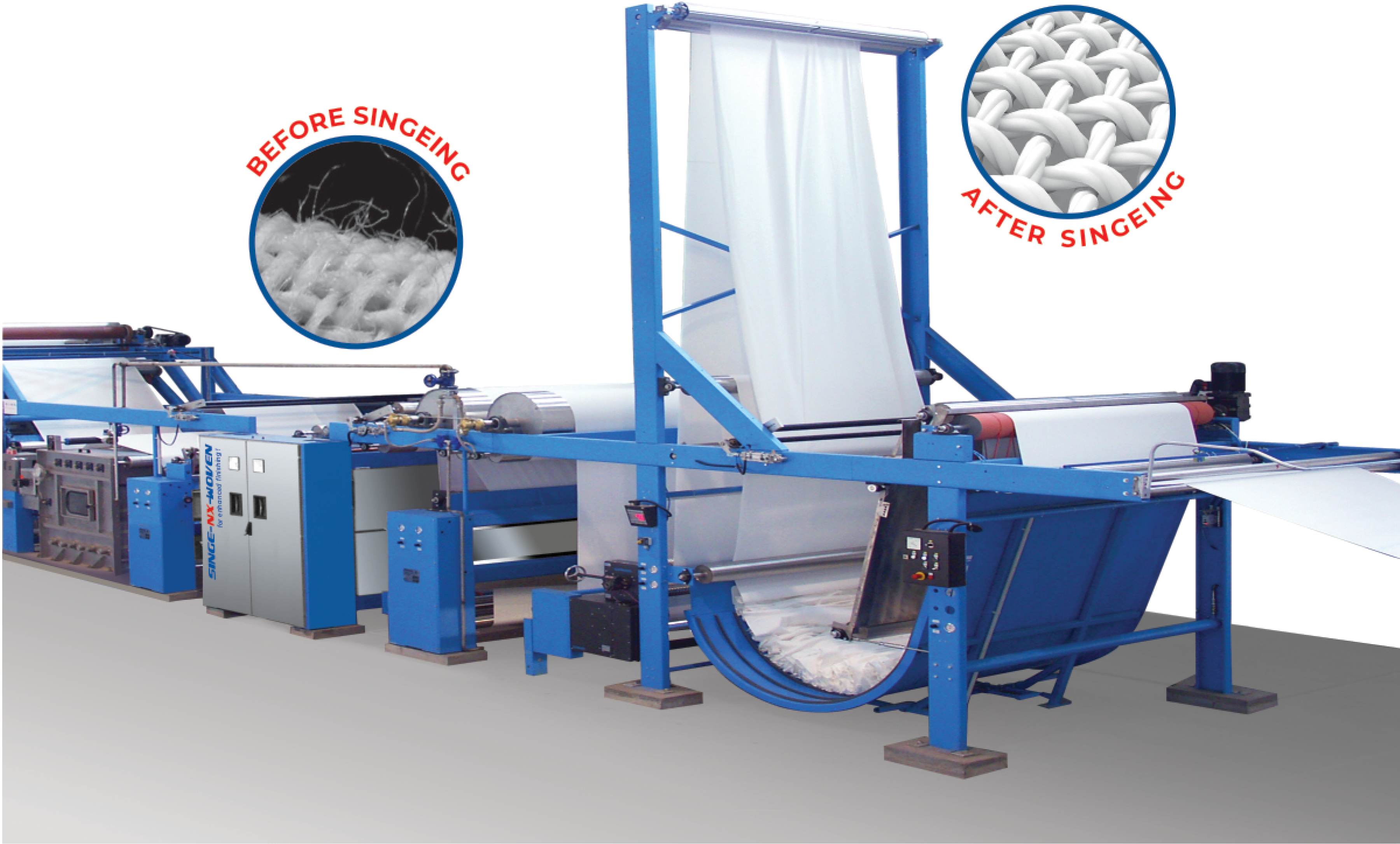 THE SINGEING PROCESS IS RECOMMENDED FOR ALL MATERIALS WHICH CANNOT TOLERATE DIRECT EXPOSURE TO FLAME. TANGENTIAL SINGEING CAN ALSO EQUALIZE PROTRUDING FIBERS AND REPAIR FILAMENT BREAKS.