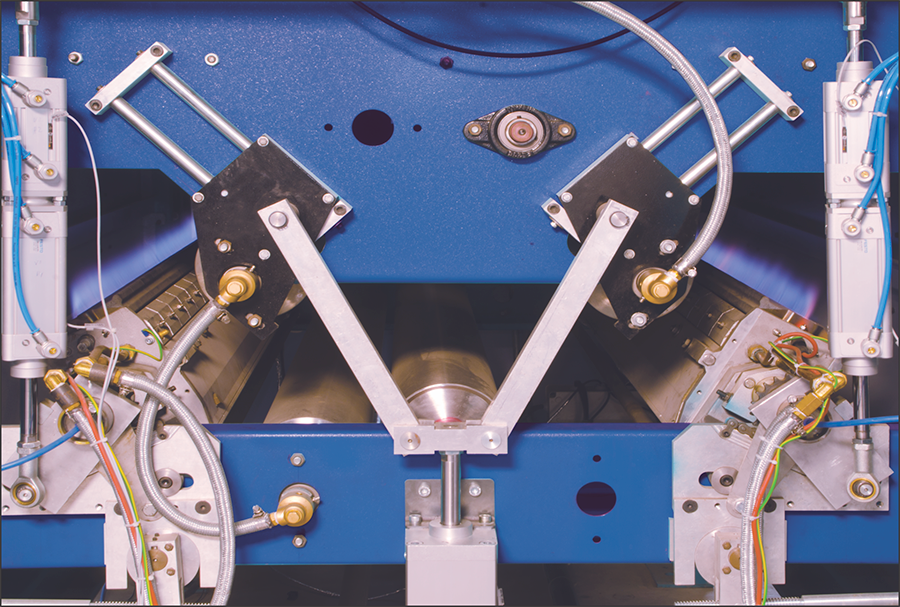 THE SINGEING FLAME MEETS THE FREE GUIDED FABRIC AT RIGHT ANGLES AS THE FABRIC PASSES BETWEEN TWO GUIDE ROLLERS. THE POSITION IS SUITABLE FOR 100% NATURAL FIBERS AND FOR BLENDED FABRICS WHICH HAVE BEEN THOROUGHLY BEATEN, WITH WEIGHTS OVER 125g/m².